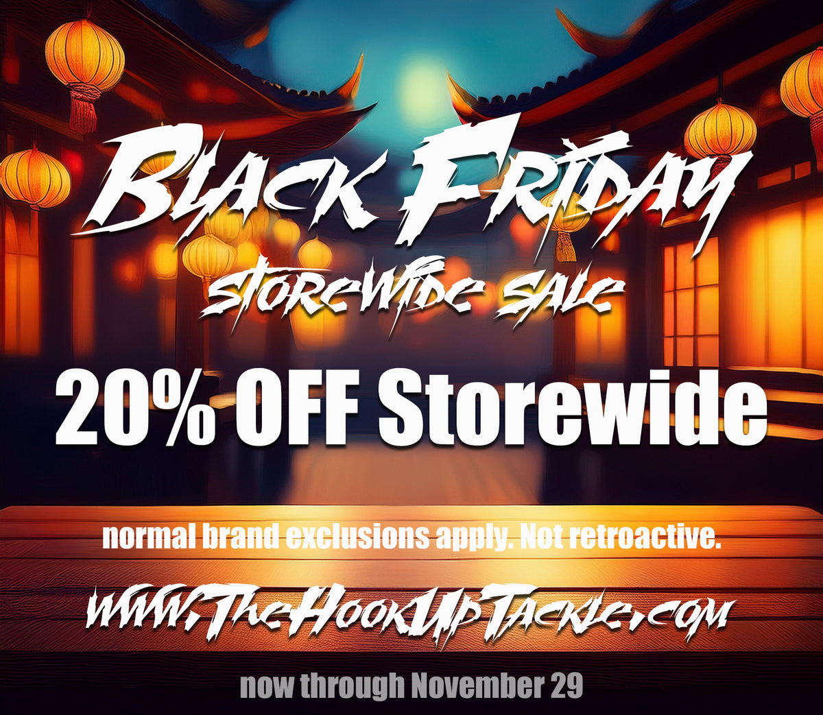 Our Black Friday Storewide Sale has officially begun! Save 20% OFF most brands Storewide now through November 29! Normal brand exclusions apply (Megabass, Shimano, Daiwa, WCZ, Gift Cards, etc). Not retroactive. Black Friday discount applies automatically in cart. Enjoy my friends!