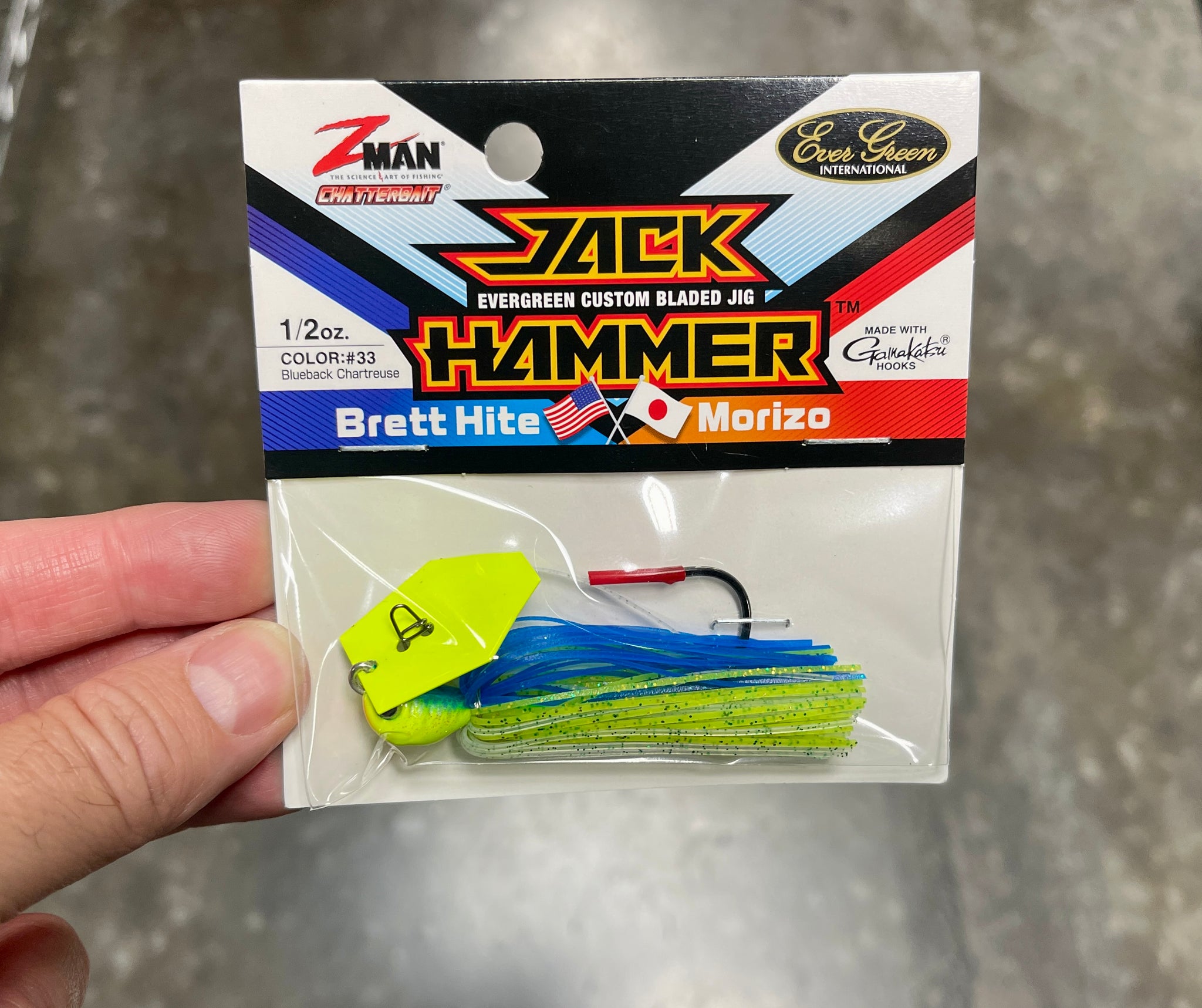 An amazing collaboration between leading japanese lure company Evergreen and Chatterbait master Zman, designed in conjuction with renowned bladed jig expert Brett Hite, has produced the highly anticipated Jackhammer. Mantufactured with the exclusively patented chatterbait bladed swimjig design and stainless hex-shape ChatterBlade, the Jackhammer also features a decoy egg snap, low center of gravity fish shape head with channel groove for blade protection, Gamakatsu heavy wire 5/0 hook, and double hook keeper. Hand tied skirts in real to life colors complete the allure. There has never been a collaboration like this before- pick up the jackhammer today!